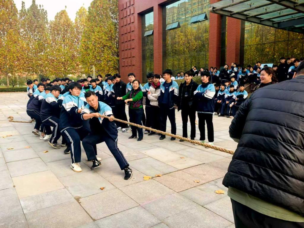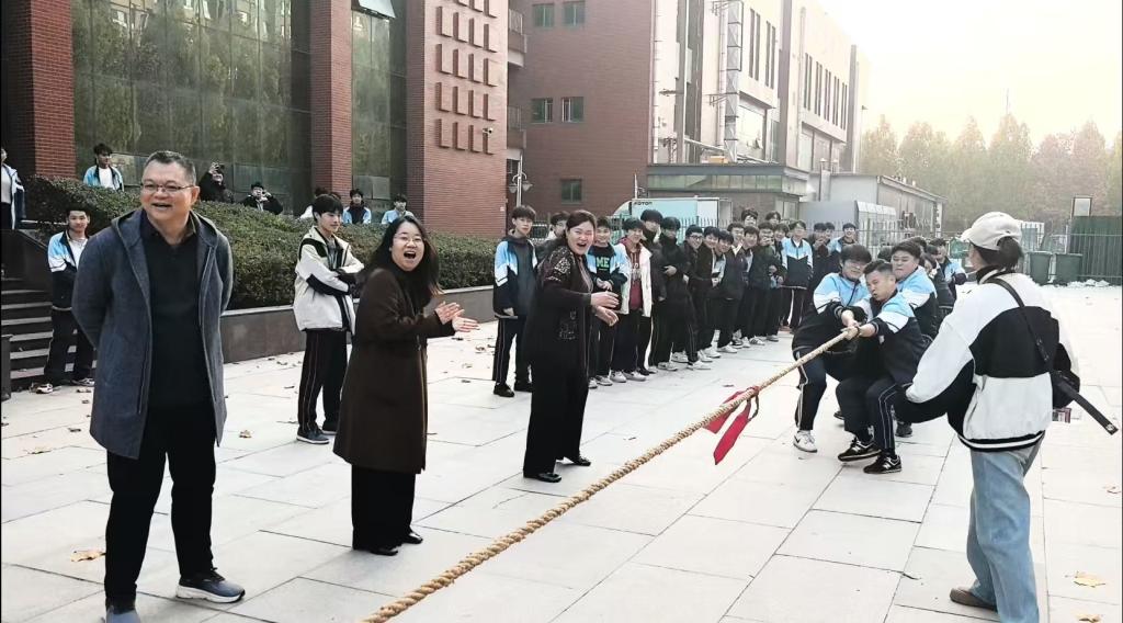 比赛现场,各班参赛队伍身着统一服装,紧握长绳严阵以待。随着裁判哨声响起,队员们身体后倾、脚步扎稳,以整齐的号子凝聚力量,麻绳上的红线在两队之间来回拉锯;场边师生组成的拉拉队挥舞旗帜、高声呐喊,加油声与欢呼声此起彼伏,将现场气氛一次次推向高潮。系部负责人与班主任也融入其中,或为队伍调整战术,或与学生一同呐喊助威,师生间的互动让赛场充满温情。