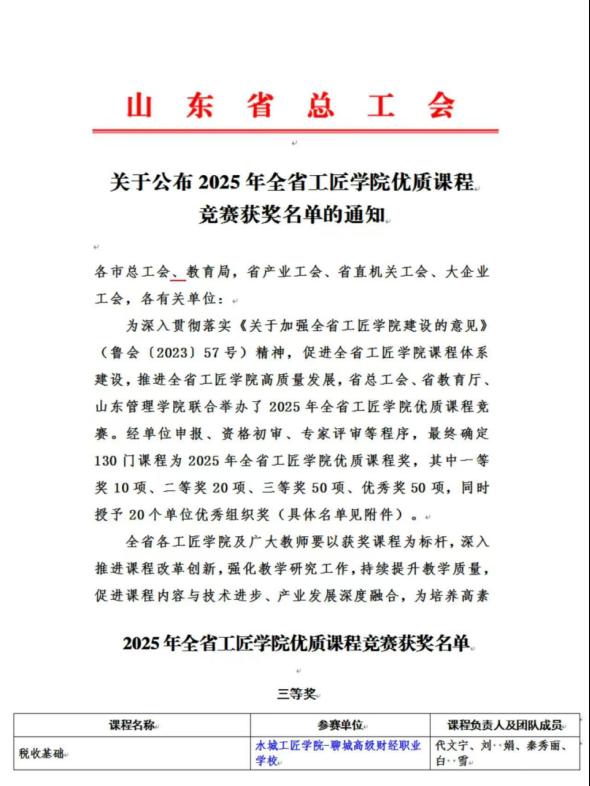 近日,在山东省总工会、省教育厅等部门联合主办的“2025年全省工匠学院优质课程竞赛”中,我校代文宁教师团队研发的《税收基础》课程荣获三等奖。