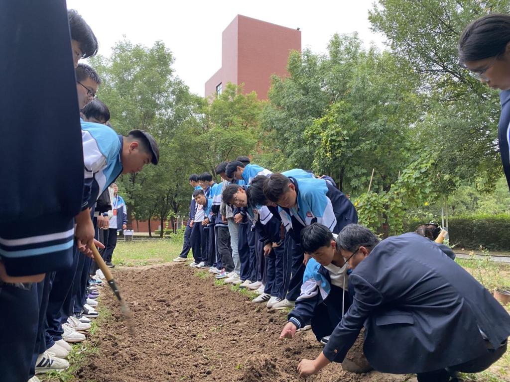 实操环节,同学们分组完成20株种苗的种植。同学们先测株距进行定点,再挥锹挖穴,两人扶苗、三人回土,层层踩实后围筑“水盆”,随后轮流提桶浇水,确保根根浇透;最后覆上一层松土保墒、记录品种、日期,现场一派井然有序、热火朝天的劳动景象,真正把课堂搬到田间地头。