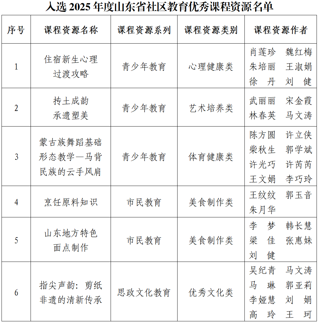 近日,山东省教育厅印发《关于公布2025年度社区教育优秀课程资源遴选结果的通知》(鲁教民函〔2025〕16号),我校精心组织报送的6门课程资源全部成功入选,彰显了学校在社区教育课程建设领域的扎实成效与鲜明特色。