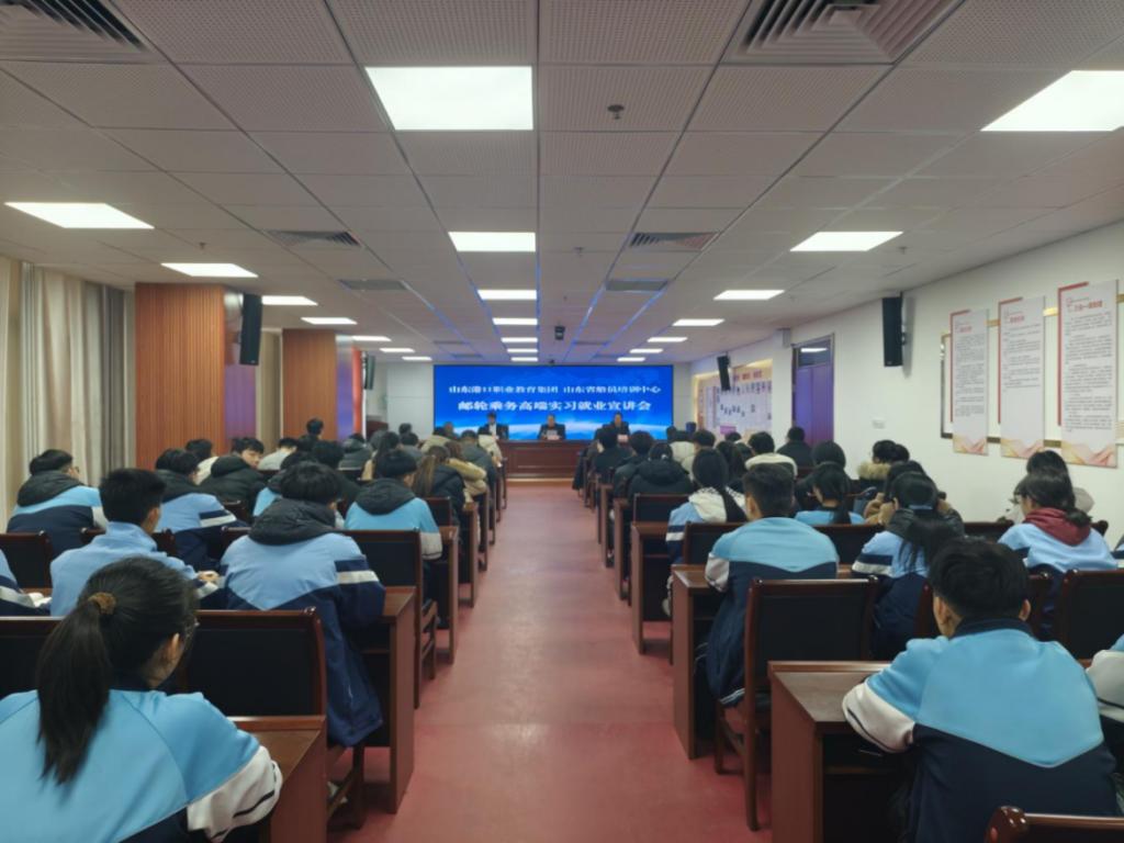 当日下午,山东省船员培训中心业务主管靳文杰面向师生开展邮轮乘务高端实习就业专题宣讲。学校招生就业处负责人、各系部分管工作负责人、相关专业教师及2023级部分学生参加。靳文杰系统解读了国际邮轮乘务行业发展前景、工作环境、岗位要求、薪资福利及职业晋升通道,并结合实际案例答疑解惑,与同学们就岗位适配性、实习安全保障等问题深入互动。
