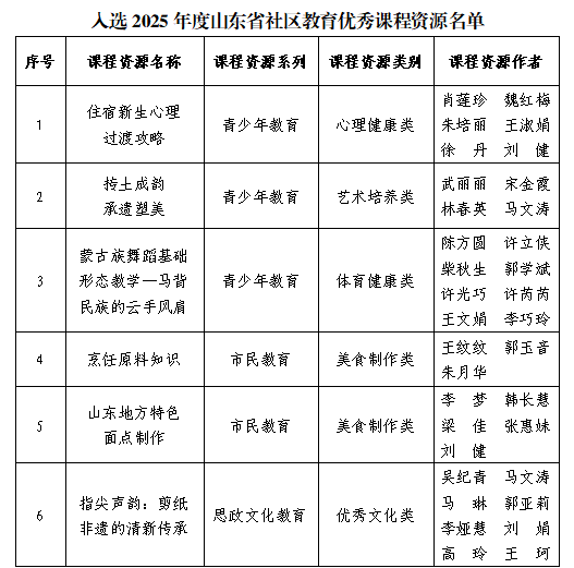 近日,山东省教育厅印发《关于公布2025年度社区教育优秀课程资源遴选结果的通知》(鲁教民函〔2025〕16号),我校有6门课程资源入选,彰显了学校在社区教育课程建设领域的扎实成效与鲜明特色。