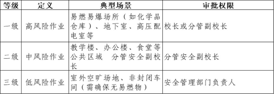 第二条 本制度适用于校内所有涉及明火或可能产生火花的作业活动,包括但不限于:实验室操作、设备维修、基建施工、食堂烹饪、艺术设计(如焊接、喷漆)等场景。