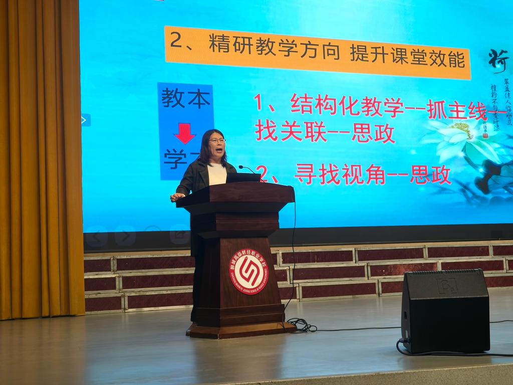 在汇报环节,四位教师结合培训所学,聚焦不同主题进行了凝练而深入的分享。王淑娟老师围绕AI辅助教学工具,解析了其功能优势与实际应用场景,并进行具体操作演示;白艳旭老师以教学能力大赛备赛为主线,从选题策略、团队组建到实施报告撰写等关键环节,系统分享了备赛经验与实用建议;黄晓萌老师聚焦思政课教学能力提升,从中职学情分析出发,深入阐述了教学设计中教学目标确立、教学重难点把握及教学环节设计的系统性方法;吴纪青老师则紧扣历史课教学实际,强调以深耕课程标准为基础,详细介绍了在课堂中落实核心素养、提升教学效能的具体路径与实践思考。