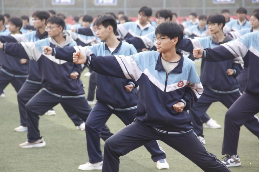 见缝插针,掌握熟练。无论是体育课,还是十分钟课间,到处都是练习的身影。班主任跟班督促,学生们从生疏到动作熟练,从熟练到劲力顺达,学生们用汗水换来了成长与蜕变。经过数周的磨合,从最初的动作生疏、队列散乱,到后来的招式娴熟、整齐划一,一套融合节奏分明、刚柔相济的武术操逐渐成型。学生们动作愈发标准,口号愈发响亮,团队默契度与日俱增。