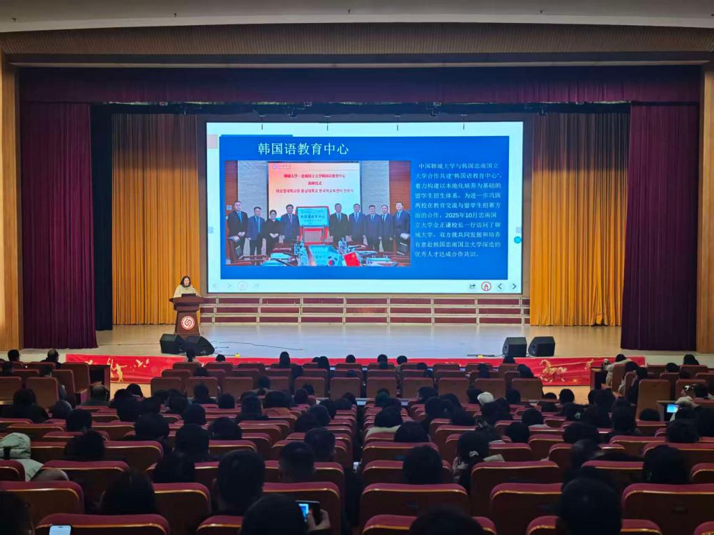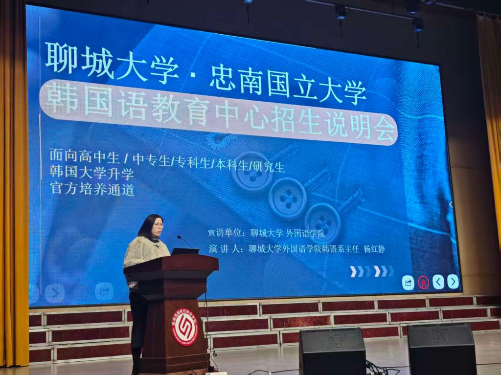 我校与韩国忠南国立大学保持着深度交流与合作关系。2024年起,双方合作开设3+4本科国际贯通班;2025年10月,韩国忠南国立大学校长金正谦一行专程到访我校,并举行留学教育基地授牌仪式,标志着两校合作迈入全新阶段。宣讲会上,杨红静主任重点介绍了聊城大学与韩国忠南国立大学共建韩国语教育中心的培训项目,依托优质教学资源为学生提供系统化、专业化的韩语培训,助力学生稳步提升韩语水平,顺利赴韩国留学深造。学生在我校完成学业后,可通过该中心完成语言提升,达到相应等级后进入韩国忠南国立大学攻读本科,形成中职—国内培训—海外本科的一站式便捷升学通道,有效强化语言能力,提升留学适应度。杨红静主任还就中心的教学师资、课程特色与培养优势进行详细解读,让学生和家长对项目模式、升学流程有了全面、清晰的认识。