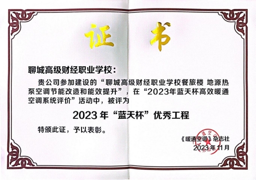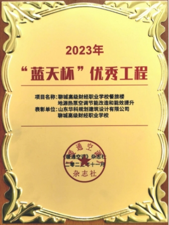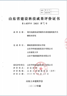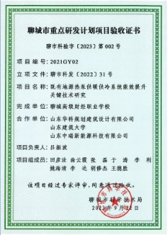该项目根据室内外温度、地温场温度及空调负荷变化,提出了基于冷热水温差变化实现质调和量调的节能运行控制策略,根据运行数据在适宜季节实现了人机协同免费供冷。并开发了系统水力调控平台,结合智慧水力动态平衡阀,实现了空调水系统的水力平衡和节能运行。取得了授权专利3项,发表论文4篇,参编省级标准1项,成果总体达到国内领先水平,获得绿色能源公益性公关项目财政扶持资金30万元。于2023年9月,被聊城市科技局授予“聊城市重点研发计划项目验收证书”;同月,被山东土木建筑学会授予“山东省建设科技成果评价证书”;2023年11月,被《暖通空调》杂志社评为“2023年‘蓝天杯’优秀工程”荣誉称号,并颁发奖牌。
