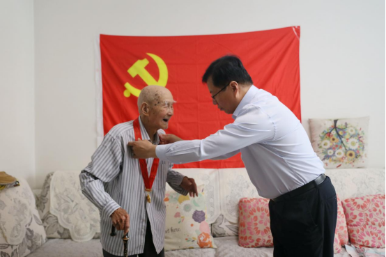 在张程久老人家里,党委委员、副校长白来生在鲜红的党旗前为老人佩戴好纪念章。这位102岁、在党75年的老人颤巍巍地站起身,含泪向党旗深深鞠躬,这份对党真挚的情感深深感动了在场的每一个人。