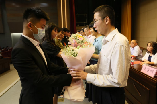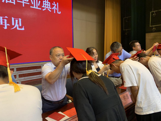学生代表给班主任献花,鞠躬感谢老师们的培养,毕业典礼圆满结束。