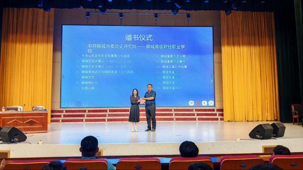 王凤娟代表研究院向学校捐赠红色文史书籍三十套,学校团委负责人代表学校接受捐赠并致谢。市委党史研究院宣传教育科一级科员李海晗作了题为《英雄的聊城——聊城抗战历史故事分享》的专题宣讲。通过一个个感人至深、振奋人心的历史故事,生动再现了聊城英雄儿女在抗战时期的坚定信念与牺牲精神,深深打动了现场师生,现场不时响起热烈掌声。
