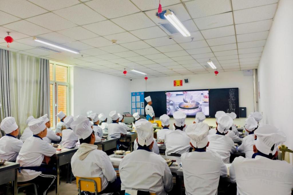 教室内,学生们身着职业服装,全神贯注地观看了高文平大师的直播授课。大师的每一个动作、每一处细节,都通过镜头传递给了每一位学生,使他们能够近距离感受并学习大师的烹饪艺术。这种“线上大师授课 + 线下技艺展示”的模式,不仅发挥了齐鲁工匠的技术引领作用,还突破了空间的局限,实现了理论与实践的深度融合,为中餐烹饪人才的培养搭建了优质平台,为传统烹饪文化的传承与发展注入了新的动力。
