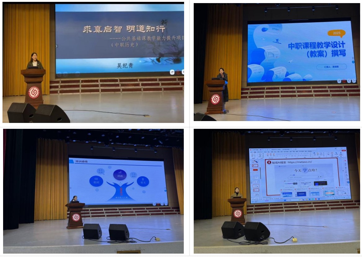 在汇报环节,四位教师结合培训所学,聚焦不同主题进行了凝练而深入的分享。王淑娟老师围绕AI辅助教学工具,解析了其功能优势与实际应用场景,并进行具体操作演示;白艳旭老师以教学能力大赛备赛为主线,从选题策略、团队组建到实施报告撰写等关键环节,系统分享了备赛经验与实用建议;黄晓萌老师聚焦思政课教学能力提升,从中职学情分析出发,深入阐述了教学设计中教学目标确立、教学重难点把握及教学环节设计的系统性方法;吴纪青老师则紧扣历史课教学实际,强调以深耕课程标准为基础,详细介绍了在课堂中落实核心素养、提升教学效能的具体路径与实践思考。