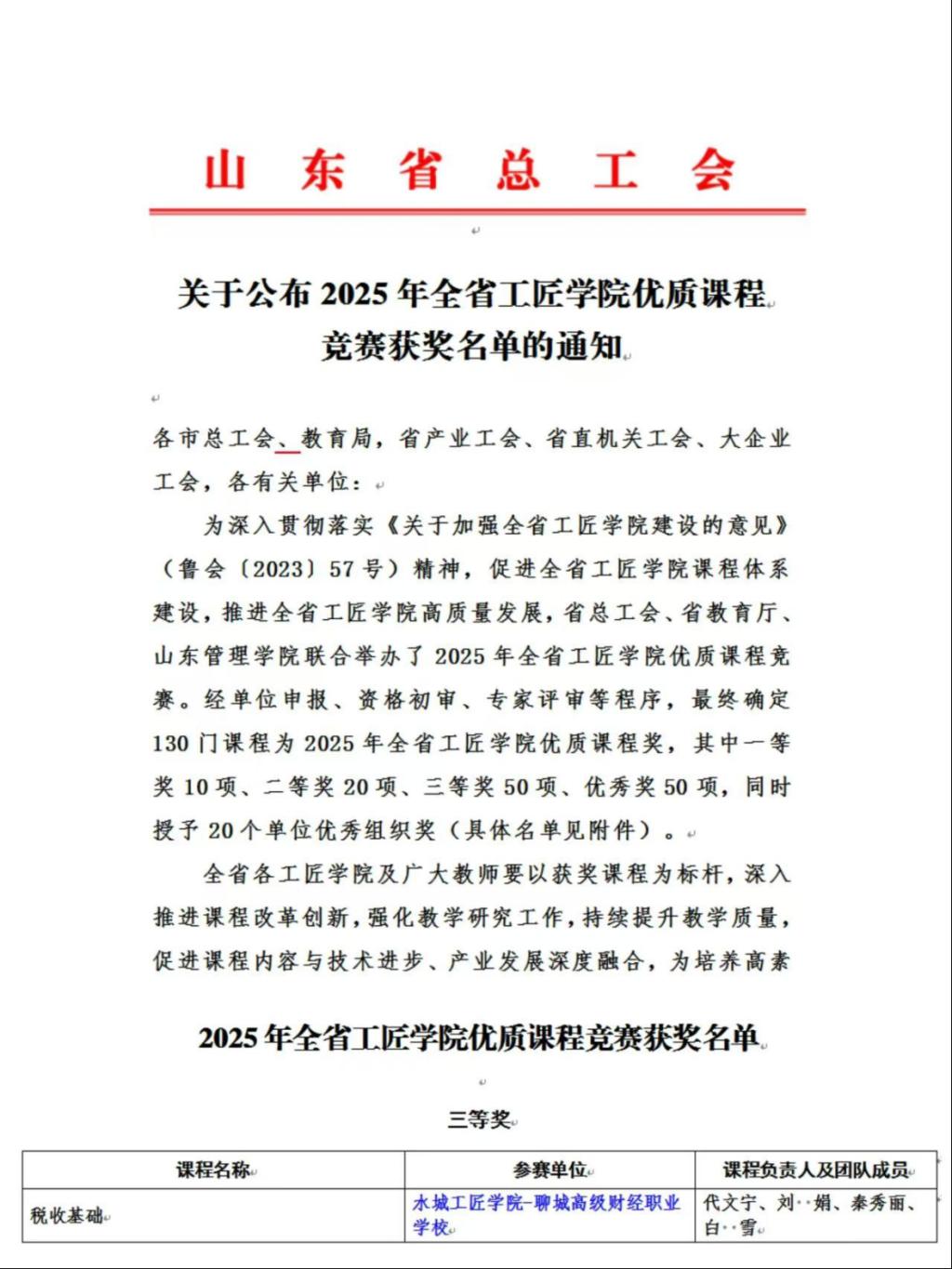 近日,在山东省总工会、省教育厅联合主办的2025年全省工匠学院优质课程竞赛中,我校代文宁教师团队打造的《税收基础》课程荣获三等奖。