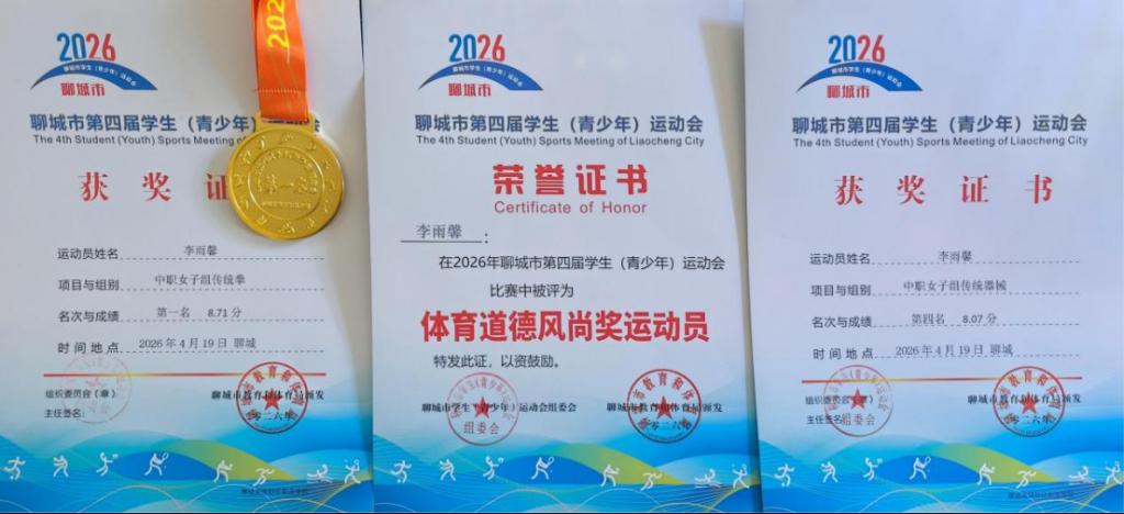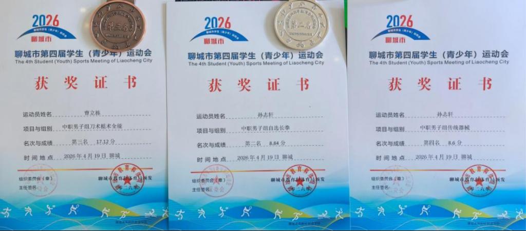 4月19日,聊城市第四届学生(青少年)运动会武术套路比赛圆满落幕。我校参赛学子奋勇拼搏,在多个项目中摘金夺银,展现了良好的竞技水平与精神风貌。