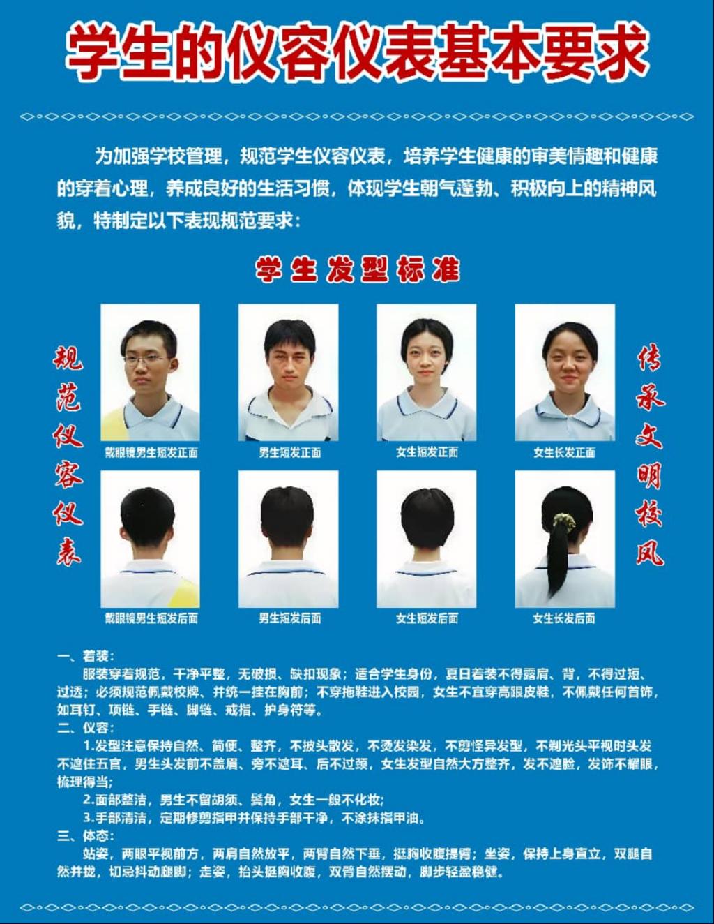 2.发型与妆容:男生不留长发、不染发、不烫发、不蓄怪异发型;女生不浓妆艳抹、不染发、不烫发、不蓄怪异发型。男女生均不得纹身。