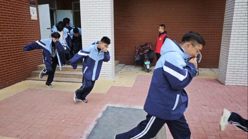 在疏散演练环节,参训师生严格按照应急预案,模拟在烟雾环境中,使用湿毛巾捂住口鼻,弯腰低姿沿预定路线撤离至指定安全区域。演练过程中,党支部志愿者分布在各关键通道和楼梯口,协助引导疏散,提醒注意事项,有效维护了现场秩序。整个过程组织严密、行动高效,切实锻炼了师生在紧急情况下的心理素质和疏散逃生技能。