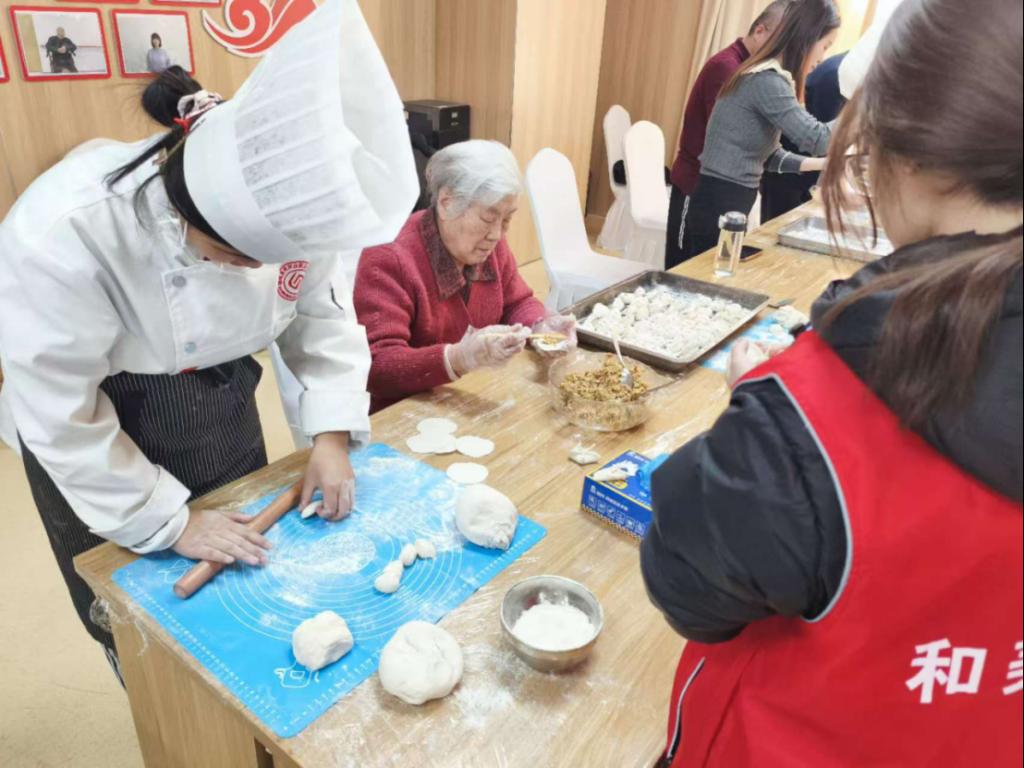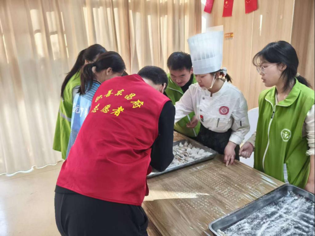 活动现场,暖意融融。师生志愿者们一到达馨泰颐养中心,就迅速分工协作,有条不紊地投入到水饺包制工作中。餐旅系的面点老师充分发挥专业优势,耐心细致地为志愿者和老人们讲解水饺包制的技巧,从面团的揉制、饺子皮的擀制,到馅料的调配、水饺的捏合,每一个步骤都讲解得清晰透彻。志愿者们认真聆听、仔细模仿,学习热情高涨,不时向老师请教。