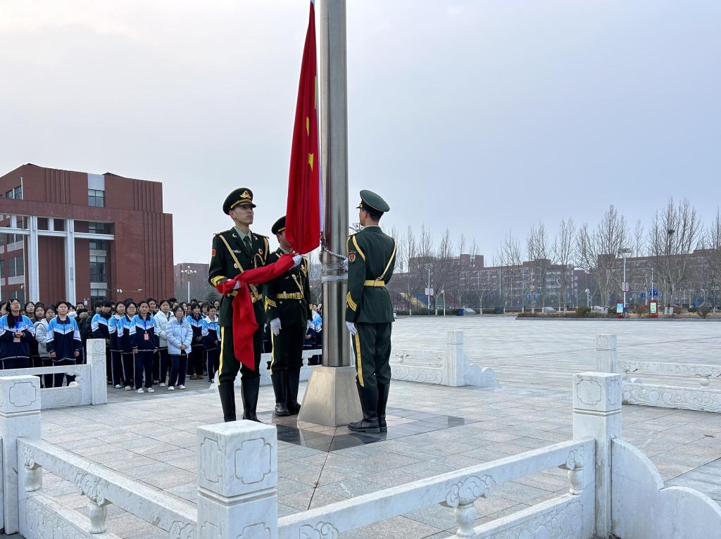 晨光之中,全体师生精神抖擞、列队整齐。伴随着雄壮嘹亮的《义勇军进行曲》,五星红旗冉冉升起、迎风飘扬。全体师生肃立注目,爱国之情与民族自豪感在心中激荡。