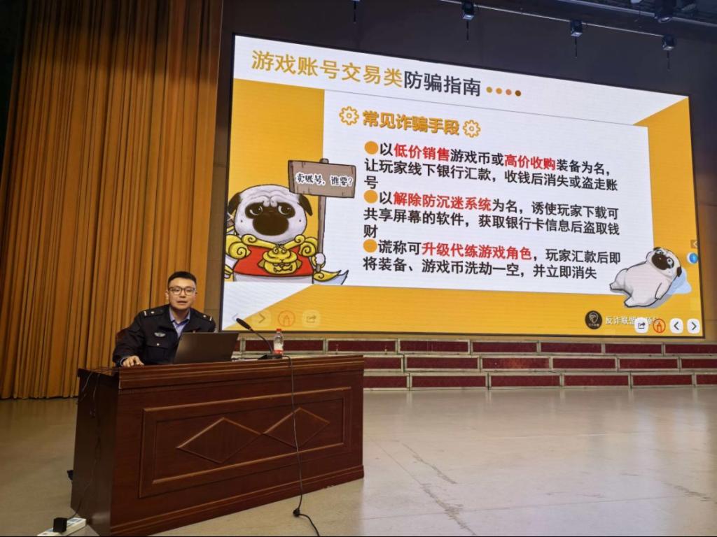 活动中,潘建宇结合真实案例,剖析当前电信网络诈骗五大特点,并重点针对学生易中招的游戏账号交易类诈骗,揭露常见诈骗手段。他告诫同学们牢记“不轻信、不转账、不透露”,遇到可疑情况及时报警求助。