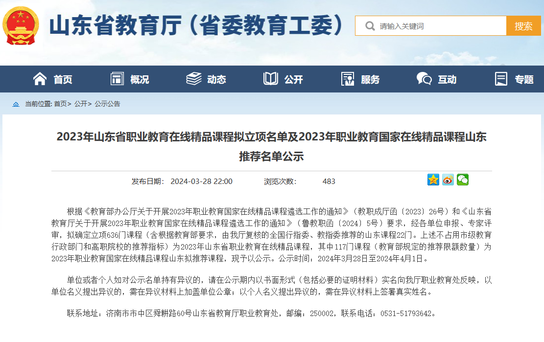 3月28日,山东省教育厅对2023年省级职业教育在线精品课程认定结果进行了公示,根据《教育部办公厅关于开展2023年职业教育国家在线精品课程遴选工作的通知》(教职成厅函〔2023〕26号)和《山东省教育厅关于开展2023年职业教育国家在线精品课程遴选工作的通知》(鲁教职函〔2024〕5号)要求,经各单位申报、专家评审,认定636门课程为2023年山东省职业教育在线精品课程。我校组织申报的两门课程获批入选。
