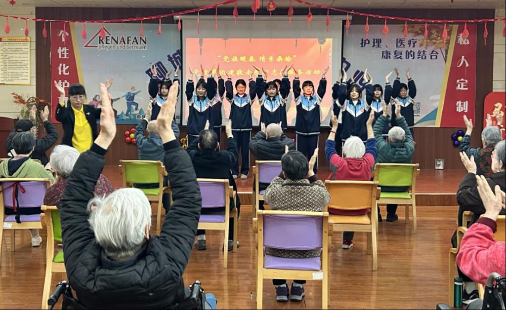 活动以党建为核心,兼顾党员宗旨教育与学生实践育人。现场温馨有序,学生们献上武术《武韵风华》、歌伴舞《如愿》、独舞《折柳》等精彩节目,赢得老人们阵阵掌声。互动环节中,同学们带领老人们做“快乐拍拍操”舒展身心,并通过“时光对话”与长者结对交流,倾听岁月故事,实现老少相融。